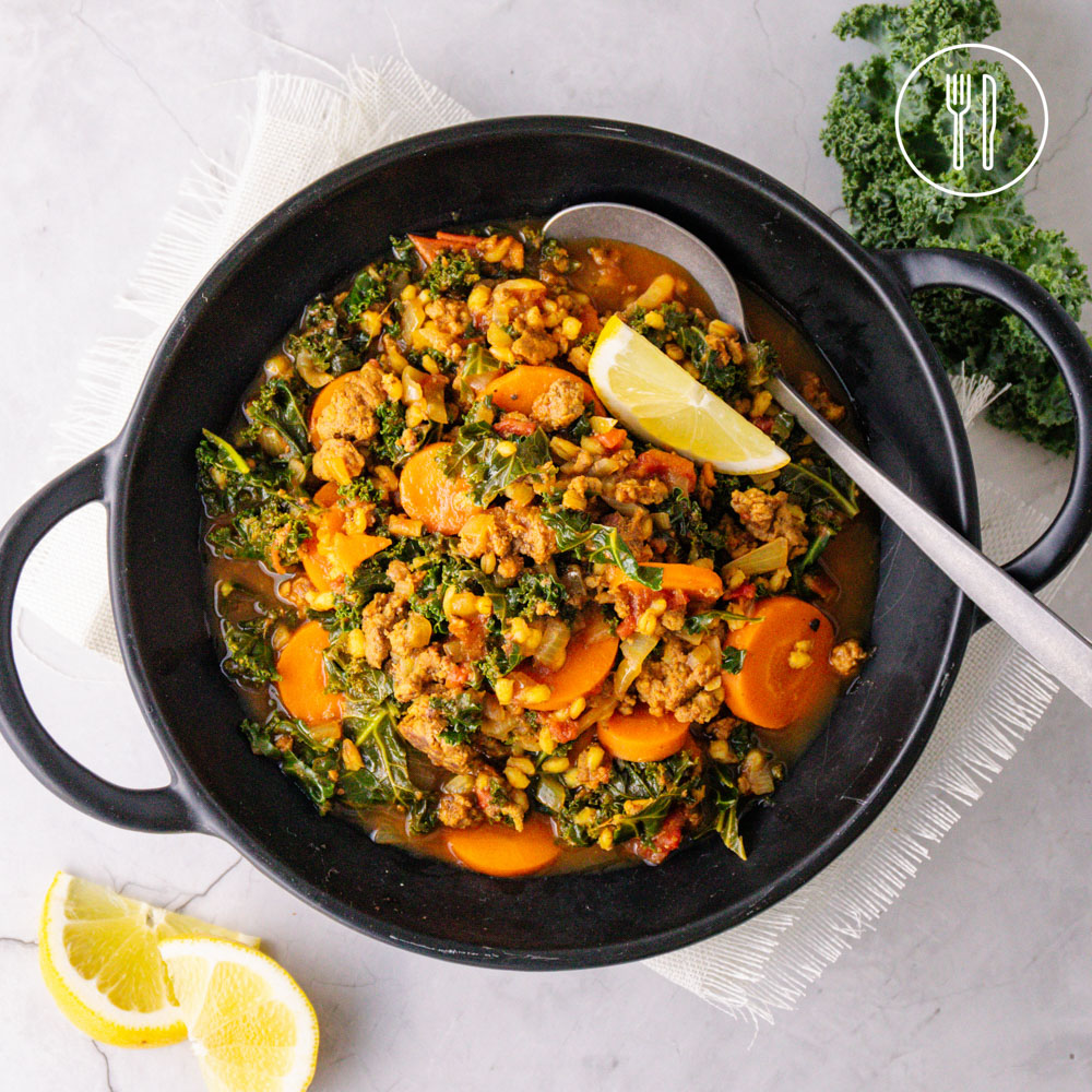 A hearty one-pot dish featuring tender lamb mince simmered with aromatic spices, pearl barley, and vibrant vegetables. Finished with fresh kale and a zing of lemon.