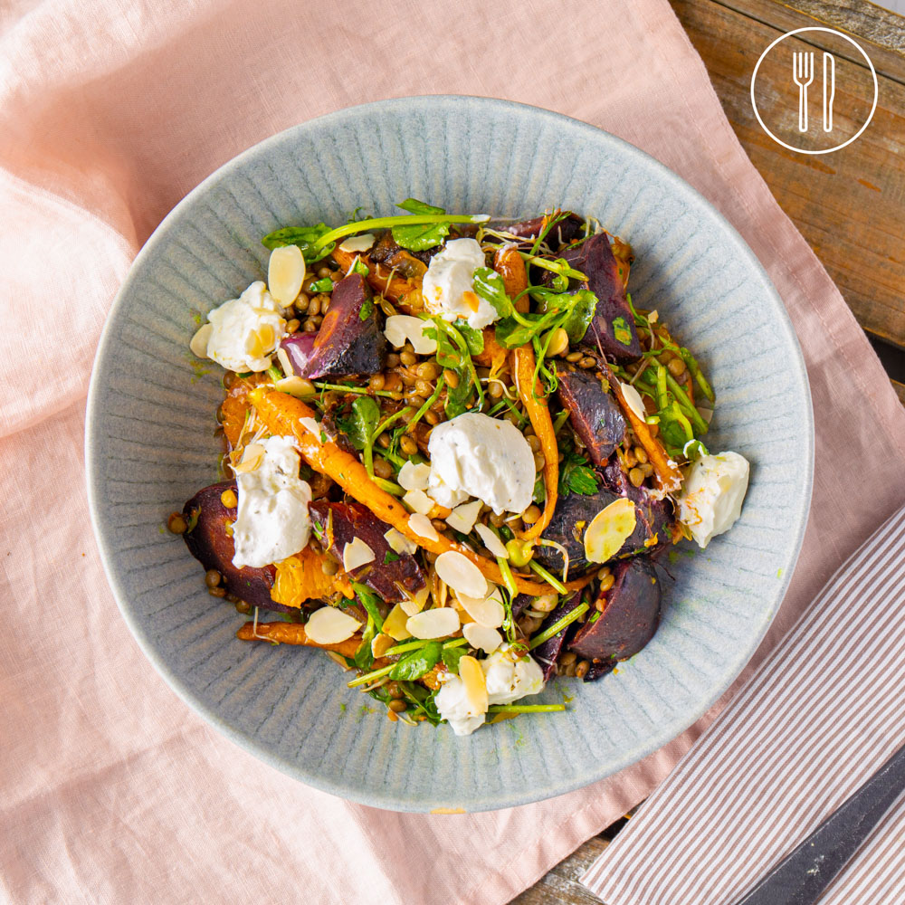 A rainbow of root veggies, roasted with Moroccan-style spices, tossed with lentils and a vibrant orange dressing served with goat cheese and toasted almonds.