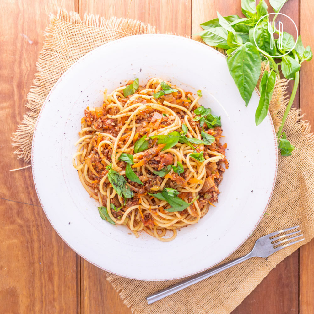 tomato sugo, fresh hemp spaghetti, celery stick, basil, carrot, brown onion, garlic clove, button mushrooms
