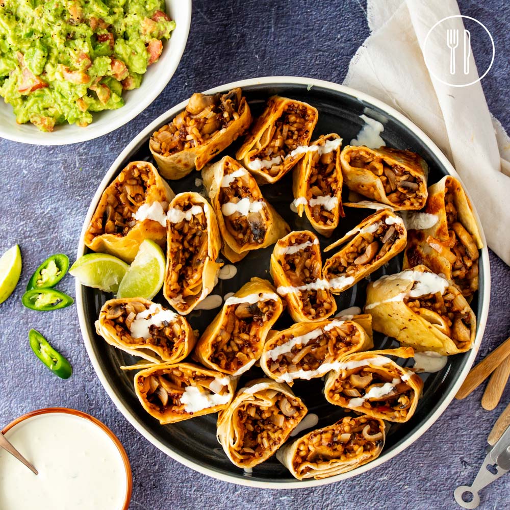 Button mushrooms, brown rice and quinoa sautéed with flavourful spices in a crispy pan-fried burrito, served with guacamole, a zingy lime sour cream drizzle and fresh jalapeño!