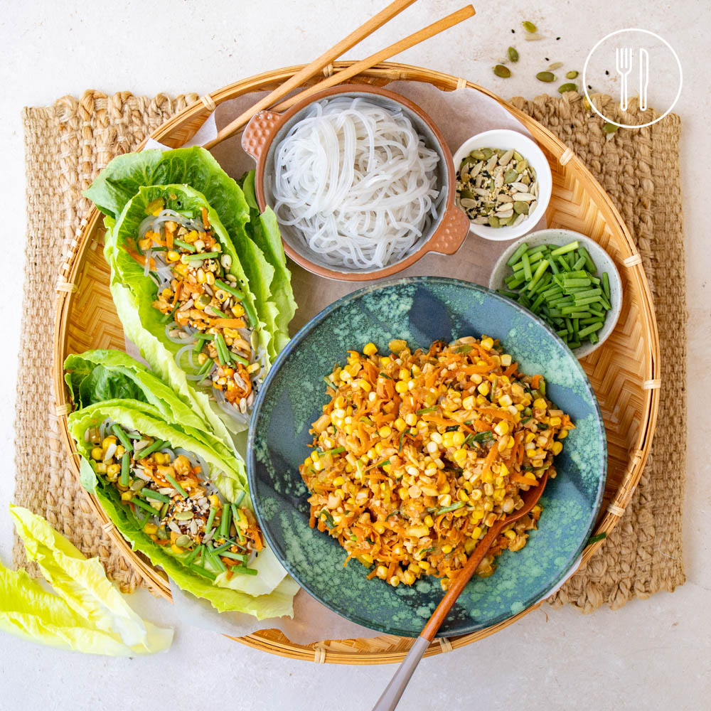 Crisp lettuce cups filled with chewy sweet potato noodles and a fragrant mushroom mince stir-fry with ginger, chives, and corn, finished with a toasted seed mix for crunch.