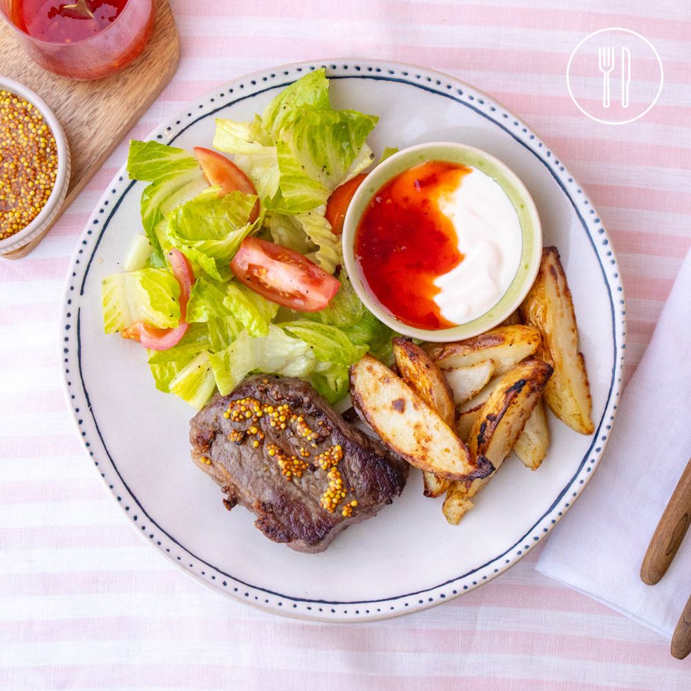 Pub dinner without having to deal with the crowds? Yes please! Beef steaks coated with mustard, served with a fresh and crunchy salad, and thick potato wedges with sweet chilli sour cream for dipping!