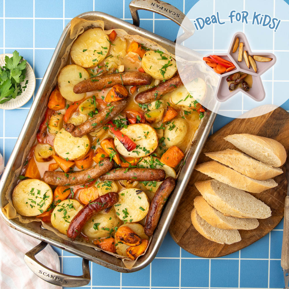 Golden potatoes and juicy beef chipolatas baked in one tray with sweet and savoury honey mustard gravy.