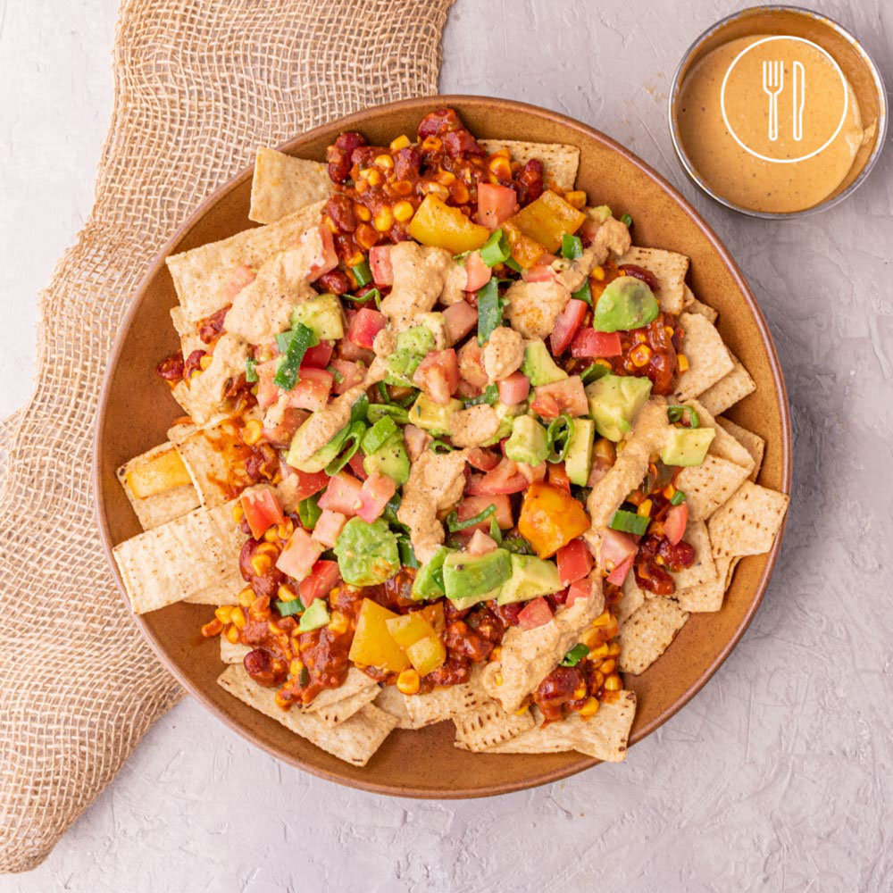 Veggie-packed nachos served with tortilla strips, fresh avocado salsa and home-made queso.