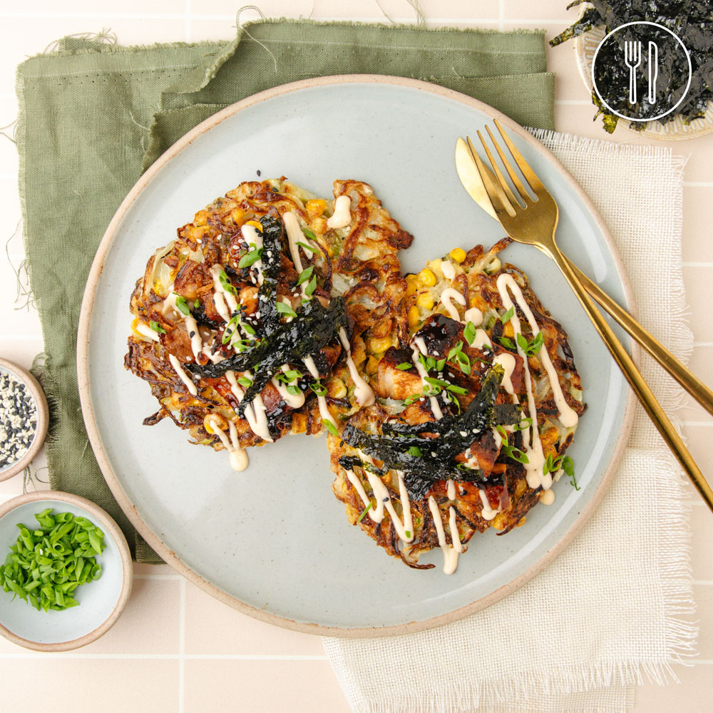 Crispy okonomiyaki-style cabbage and sweetcorn pancakes made with a light gluten-free flour blend, topped with golden pork belly strips and finished with sriracha mayo, sesame seeds and crunchy seaweed.