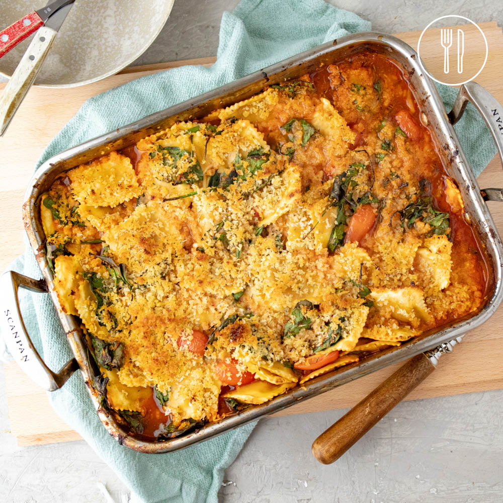 This one-dish wonder is perfect to fill the bellies of the whole family. Spinach and ricotta ravioli, tossed with tomato sugo and vegetables and baked with crunchy panko crumb topping.