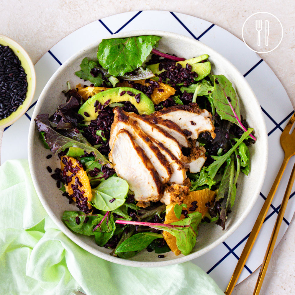 chicken breast fillet, chicken breast fillets, black rice, mesclun leaves, avocado, orange