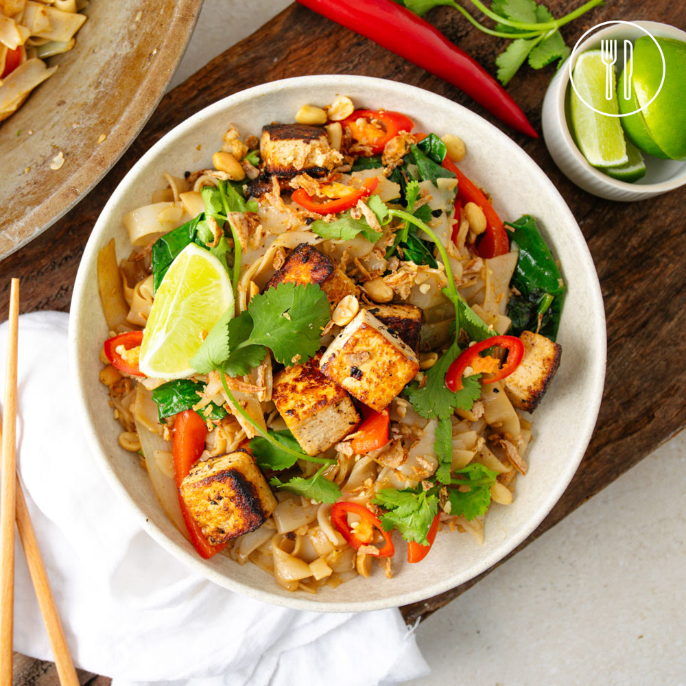 Chewy rice noodles are wok-tossed with crisp veggies, smoky sauce, and golden pan-fried tofu, then finished with crunchy peanuts, fried shallots, fresh coriander, and a squeeze of lime.