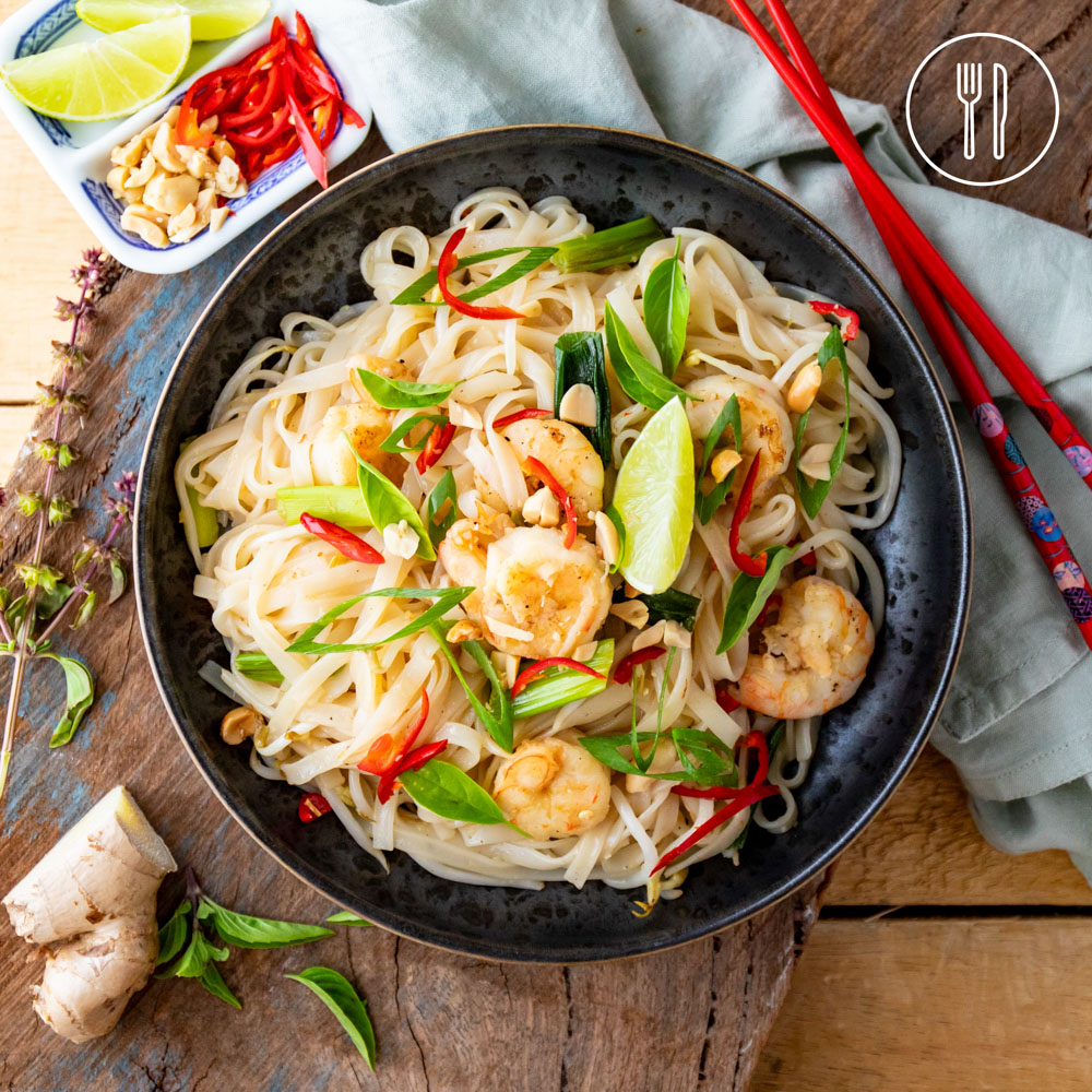 Whip up this much loved noodle dish in no time! Fresh prawns tossed in a hot pan with rice noodles, vegetables and a perfectly balanced sweet, salty and sour sauce. Finished with lime, chopped peanuts and chilli.