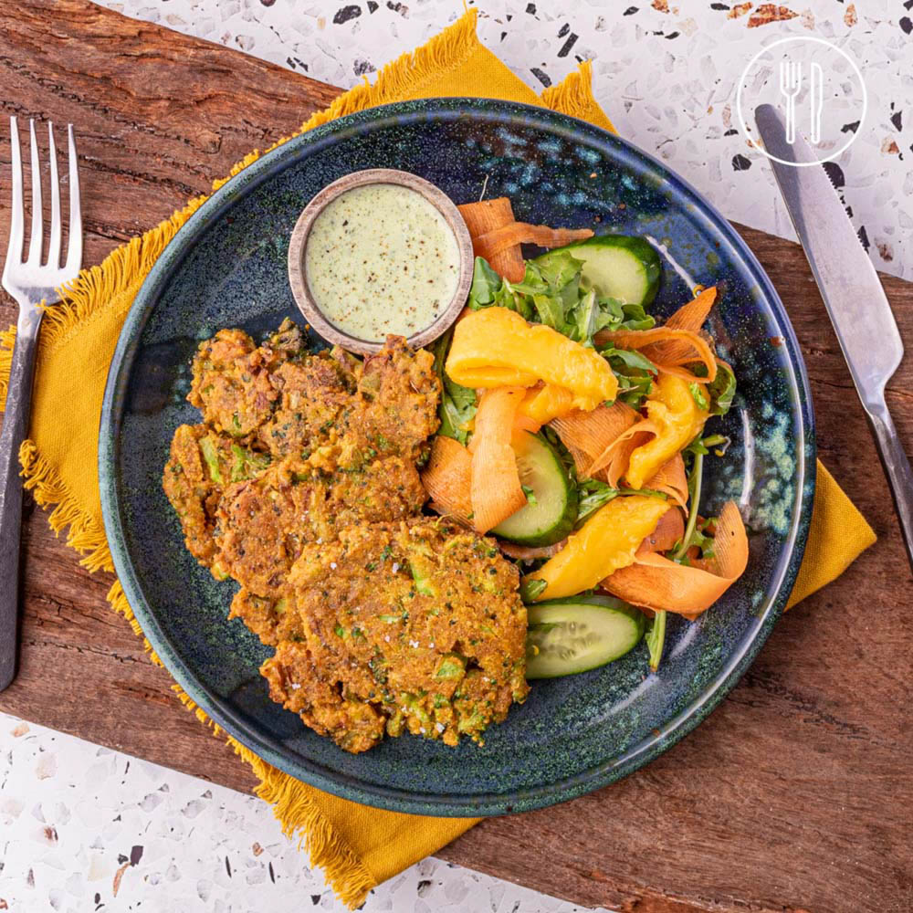 Indian-spiced Pakoras, packed full of broccoli, served with a mint sauce and fresh stone fruit salad.