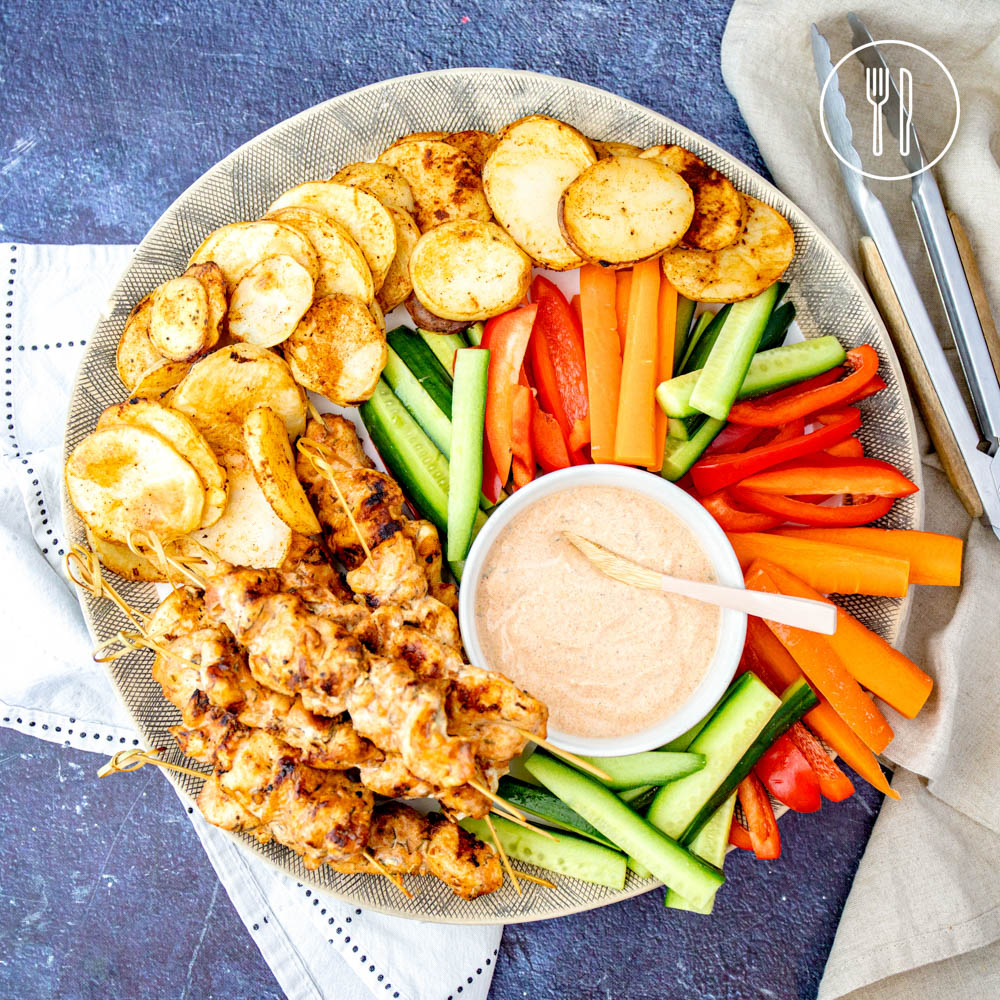 Chicken skewers barbecued with a paprika and herb rub, served alongside crispy potato rounds, rainbow veggie sticks and a yoghurt dip.
