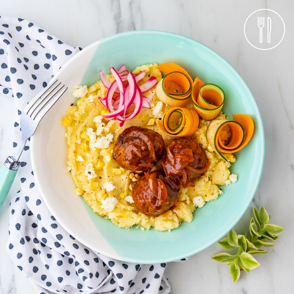 Mildly spiced beef meatballs in a sweet tomato pan sauce served over polenta cooked with feta cheese and fresh corn. Finished with pickled onion and served alongside a ribbon salad.
