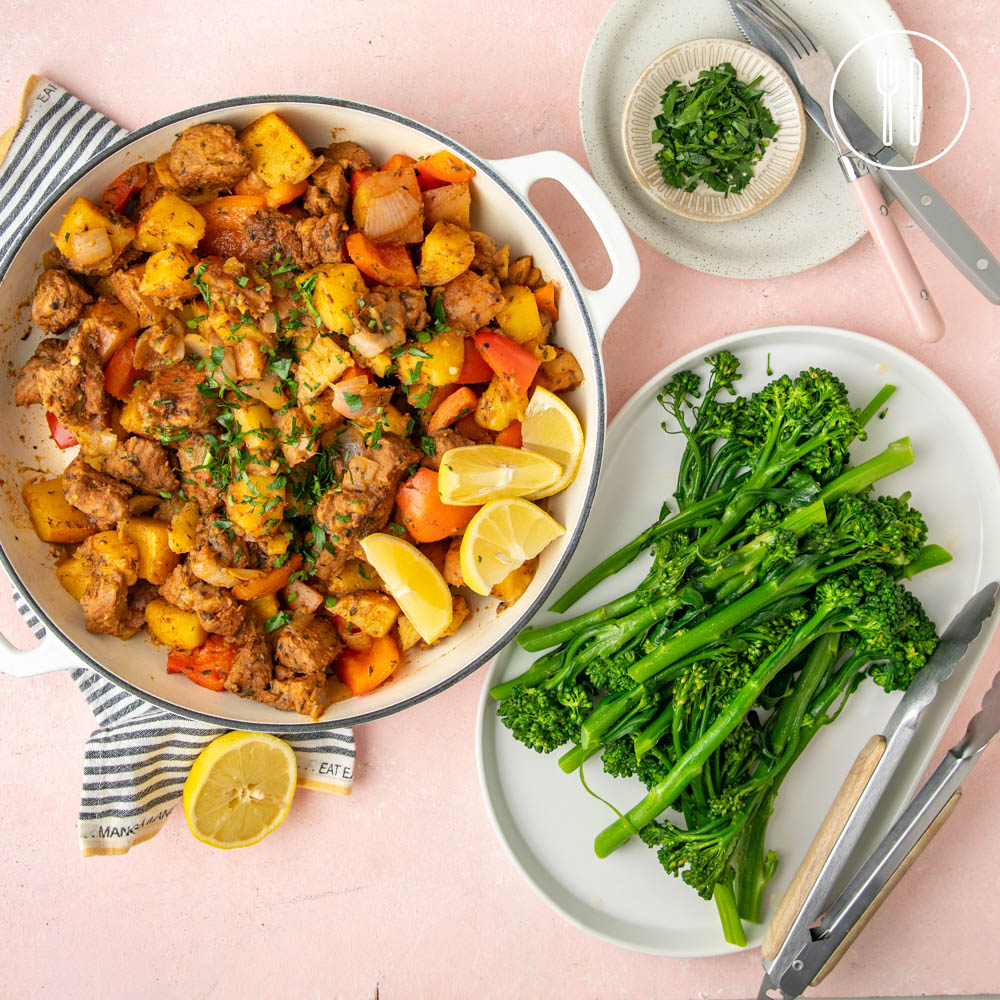 paprika herb mix, paprika herb spice mix, pork diced, parsley, broccolini, red capsicum, lemon, brown onion, garlic clove, medium red potatoes