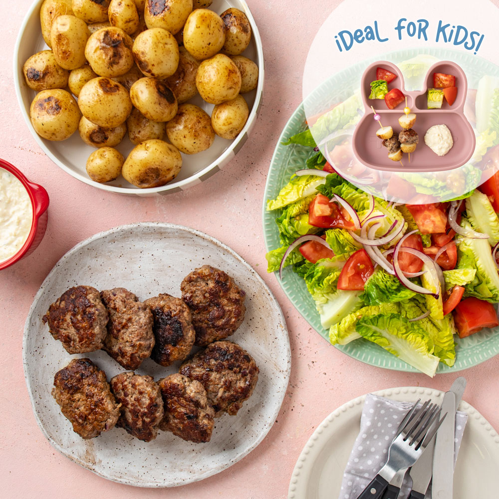 beef mince, natural yoghurt, grated parmesan, gem lettuce, red onion, tomato, baby potatoes