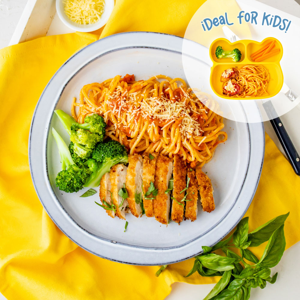 chicken schnitzels, panko crumbs, tomato sugo, long pasta, grated parmesan, basil, broccoli, carrot, brown onion