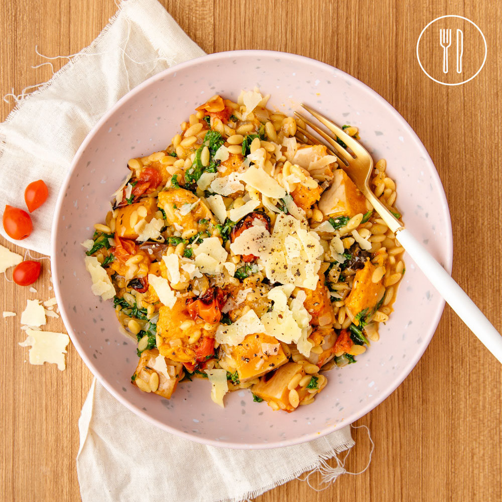 A comforting risoni tossed with roast pumpkin and tomatoes, earthy forest mushrooms and kale, finished with shaved parmesan for a rich and savoury finish.