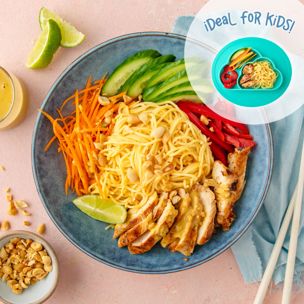 Grilled chicken, saucy peanut noodles, quick veggies and crunchy peanuts makes a fresh, colourful noodle bowl for everyone.