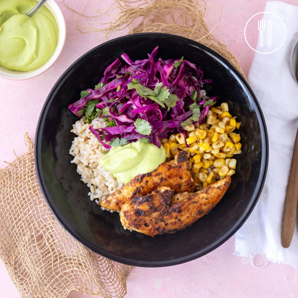 Chicken tenderloins marinated in a custom peri peri sauce and served over nutty brown rice with charred corn kernels, red cabbage slaw and a smooth avocado cream.