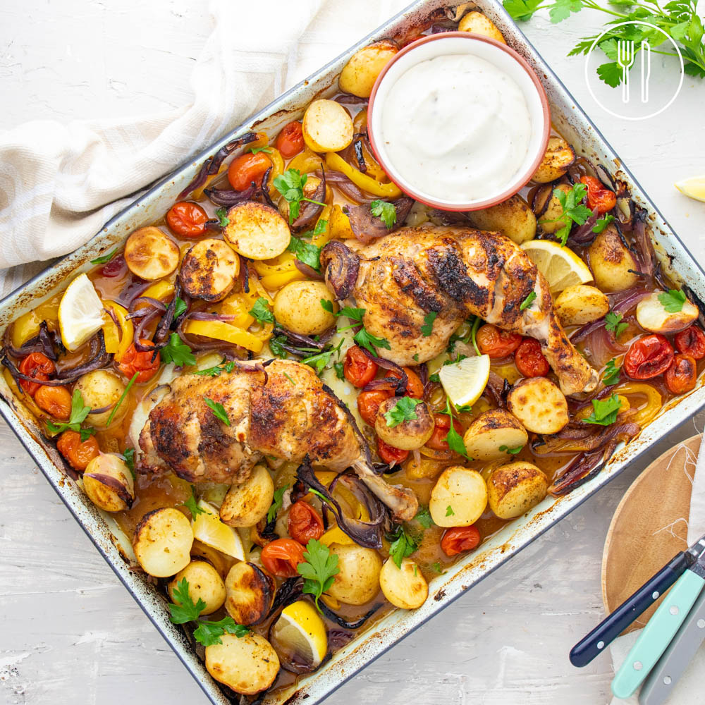 An all-in-one traybake packed with flavour! Peri Peri spiced chicken Marylands roasted with baby potatoes, cherry tomatoes, onion and capsicum, finished with lemon and parsley and served with aioli.