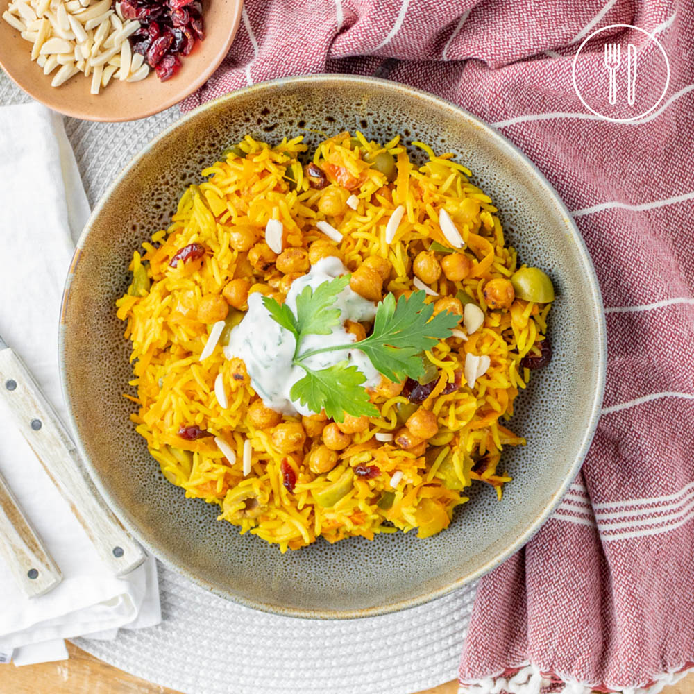 Fluffy turmeric rice with hints of cinnamon and sweet cranberries, layered with crispy chickpeas and olives and finished with a parsley yoghurt dollop for serving.