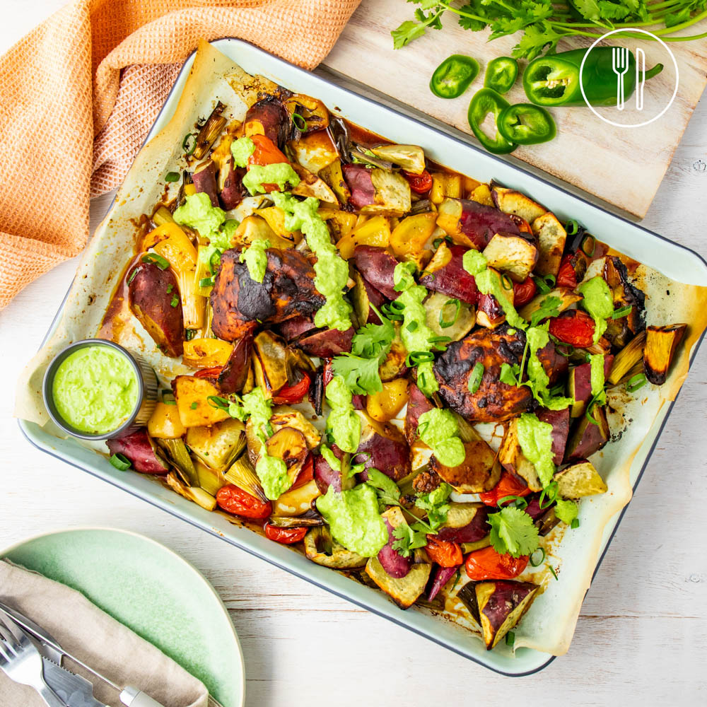 Peruvian marinated skin-on chicken breast roasted with white sweet potato, capsicum and cherry tomatoes and served with yoghurt-based aji verde.