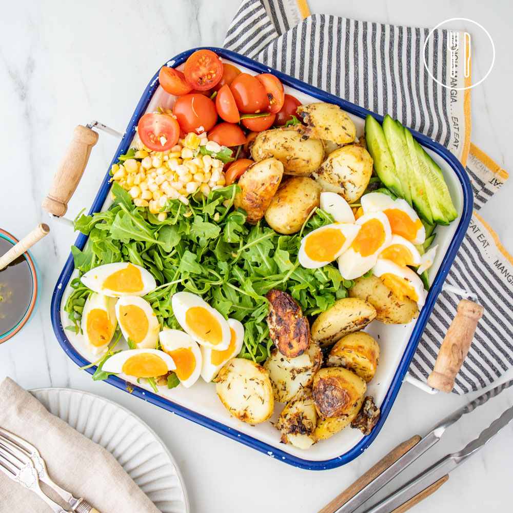 free-range eggs, crunchy basil dip, rocket leaves, cherry tomatoes, corn cob, Lebanese cucumber, baby potatoes
