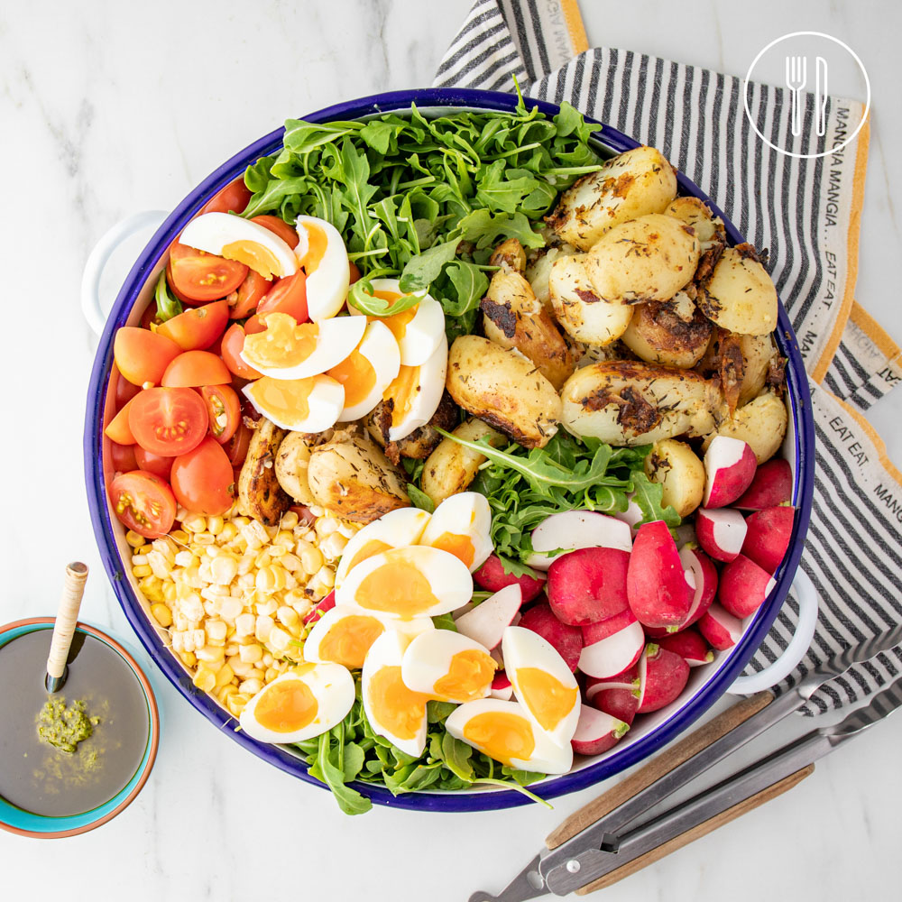 free-range eggs, crunchy basil dip, rocket leaves, cherry tomatoes, corn cob, radishes, baby potatoes