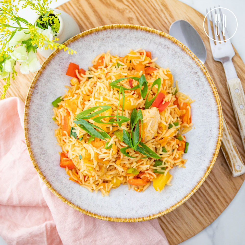 Sweet and savoury fried rice with a tropical feel! Diced chicken breast, tossed with pineapple rice with all the colourful veggies, flavoured with kaffir lime leaves and sweet chilli sauce.
