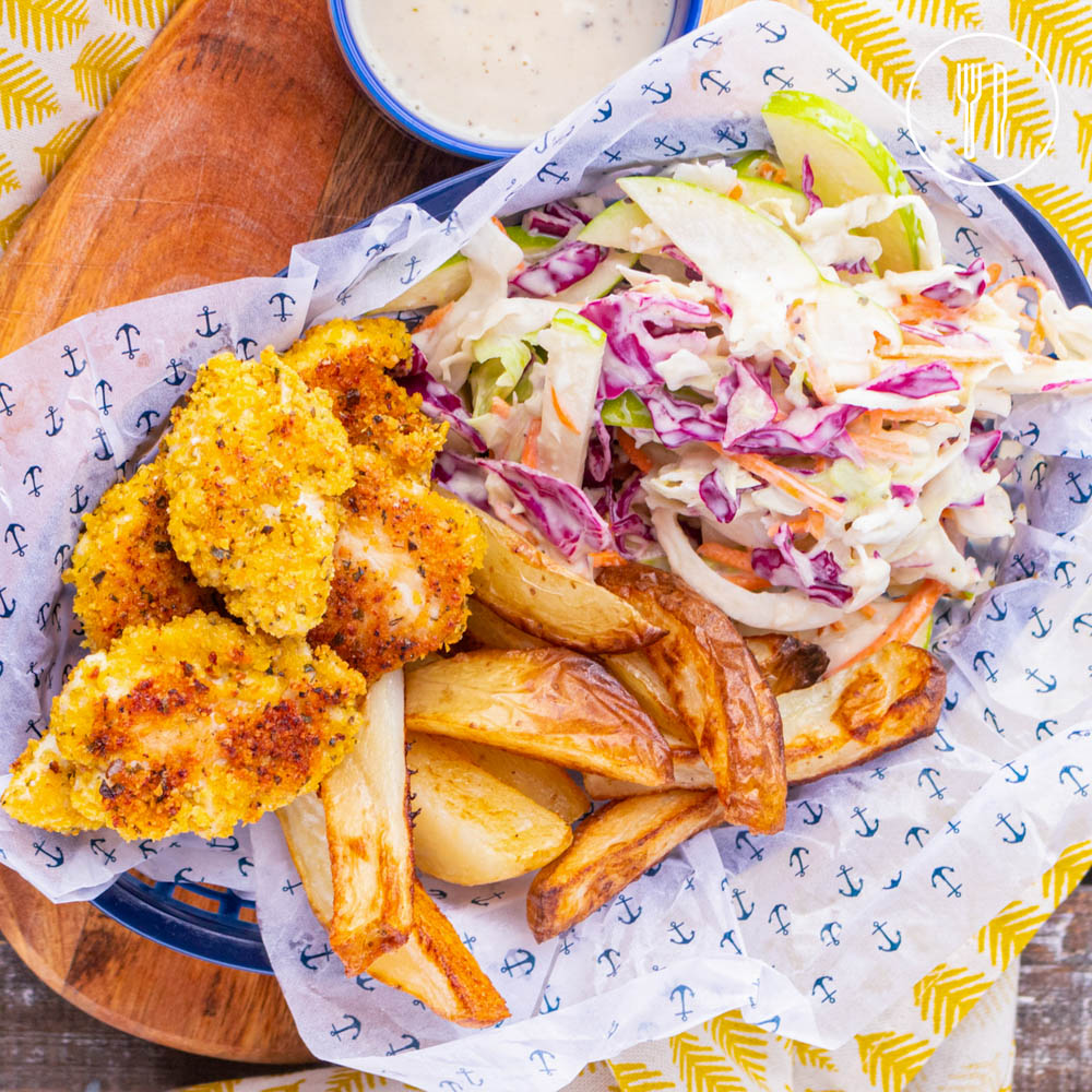 Golden chicken nuggets coated in a delicious herb & garlic crumb served with roast potato chips and a creamy coleslaw salad.