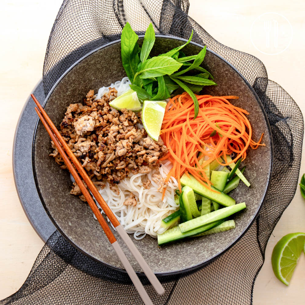 A fresh and fragrant noodle bowl with pork mince, salad toppings, mint and lime.