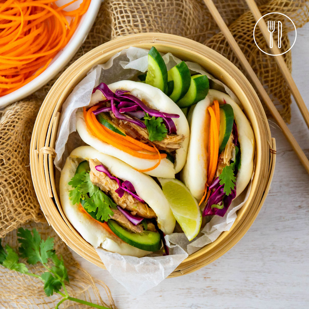 Free-range chicken cooked in an aromatic broth and pulled, stuff into fluffy bao buns with a fresh rainbow of vegetables.