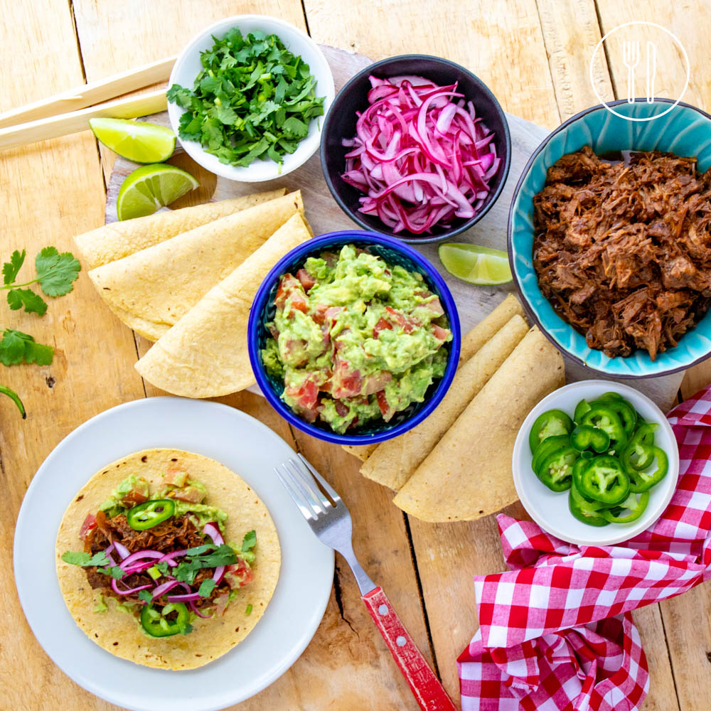 beef chuck roast, chipotle spice mix, tomato paste sachet, corn tortillas, coriander, avocado, jalapeno chilli, lime, red onion, tomato