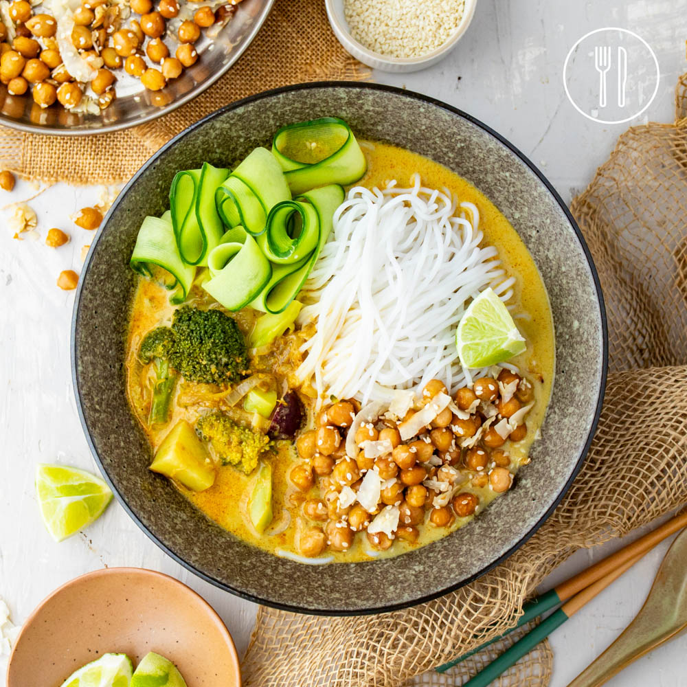Fragrant and delicious red Thai curry cooked with broccoli and white sweet potato, served over rice vermicelli noodles with a crispy chickpea, coconut and sesame seed topping.