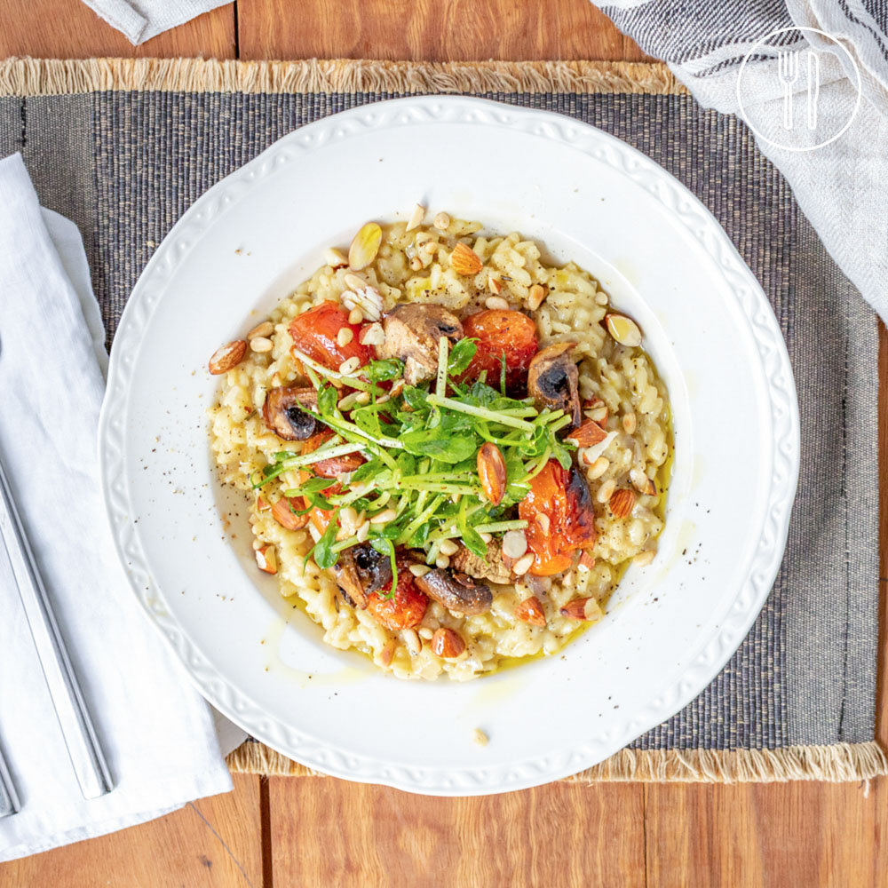 This risotto is sure to be a favourite, enriched with nutritional yeast and topped with roasted cherry tomatoes, mushrooms, crunchy nuts and watercress.