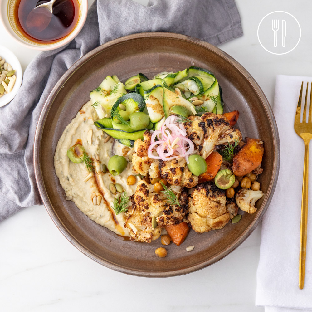 Crispy roasted chickpeas, cauliflower and carrots, served over creamy baba ganoush with a fresh ribboned zucchini, lemon and dill topping, Sicilian olives and pickled shallot.