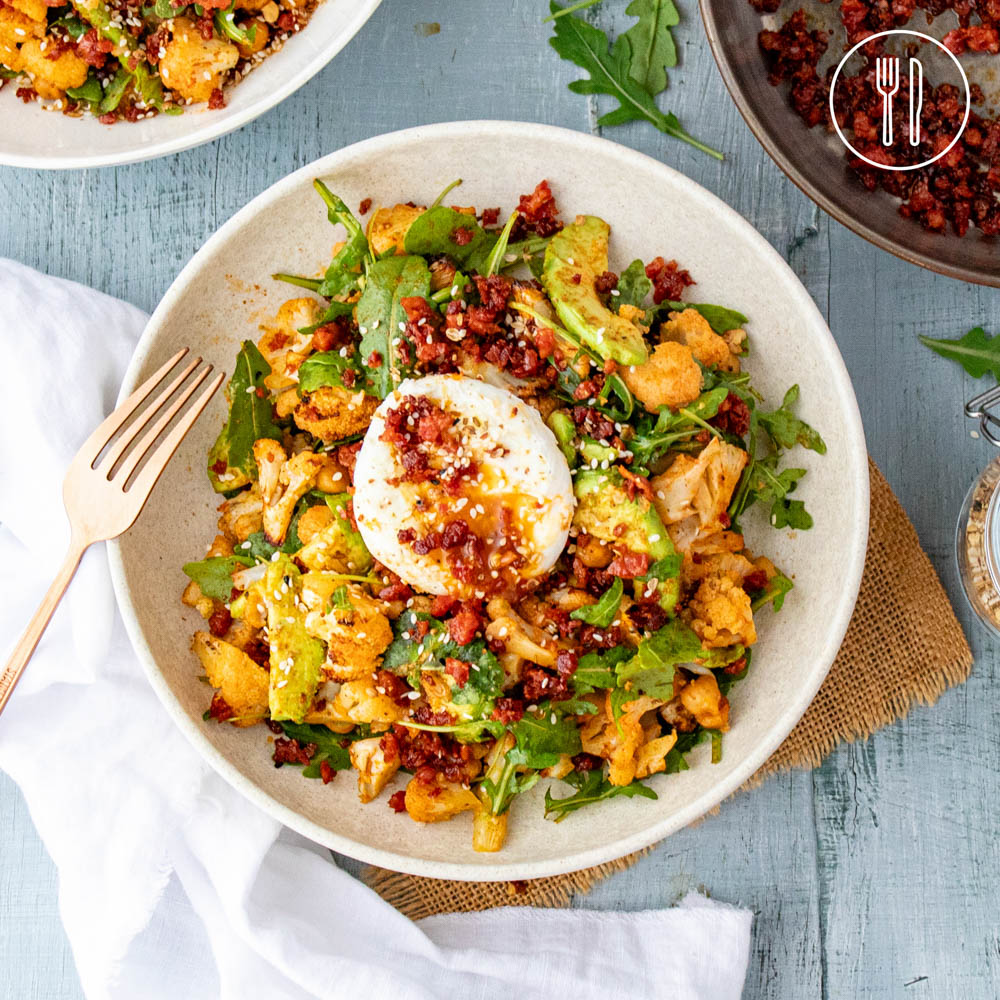 Smoky roast cauliflower with crispy chickpeas tossed with creamy avocado and rocket, topped with a poached egg and finished with a lemon dressed chorizo crumb for spice.
