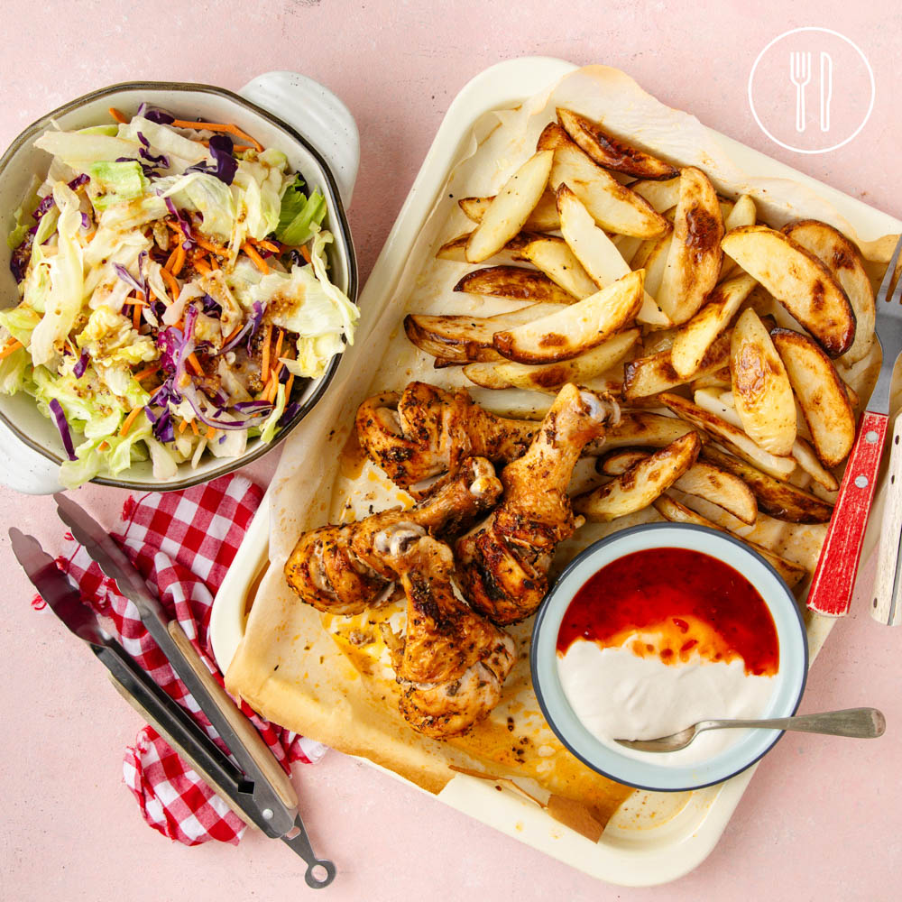 A no fuss roast dinner with juicy chicken drumsticks and fresh salad served with golden wedges, and sweet chilli, sour cream dip.