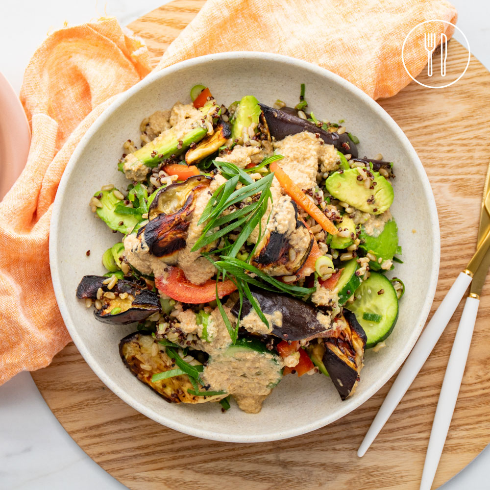 A dish full of flavour and nutrition with golden roast miso eggplant pieces, creamy avocado, crisp capsicum and cucumber tossed together with brown rice and quinoa before drizzled with a toasted sesame and ginger dressing.