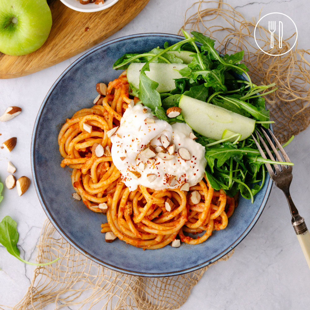 Bucatini pasta, tossed through home-made charred capsicum romesco sauce, served with a fresh apple and rocket leaf salad, creamy burrata cheese and extra toasted almonds.