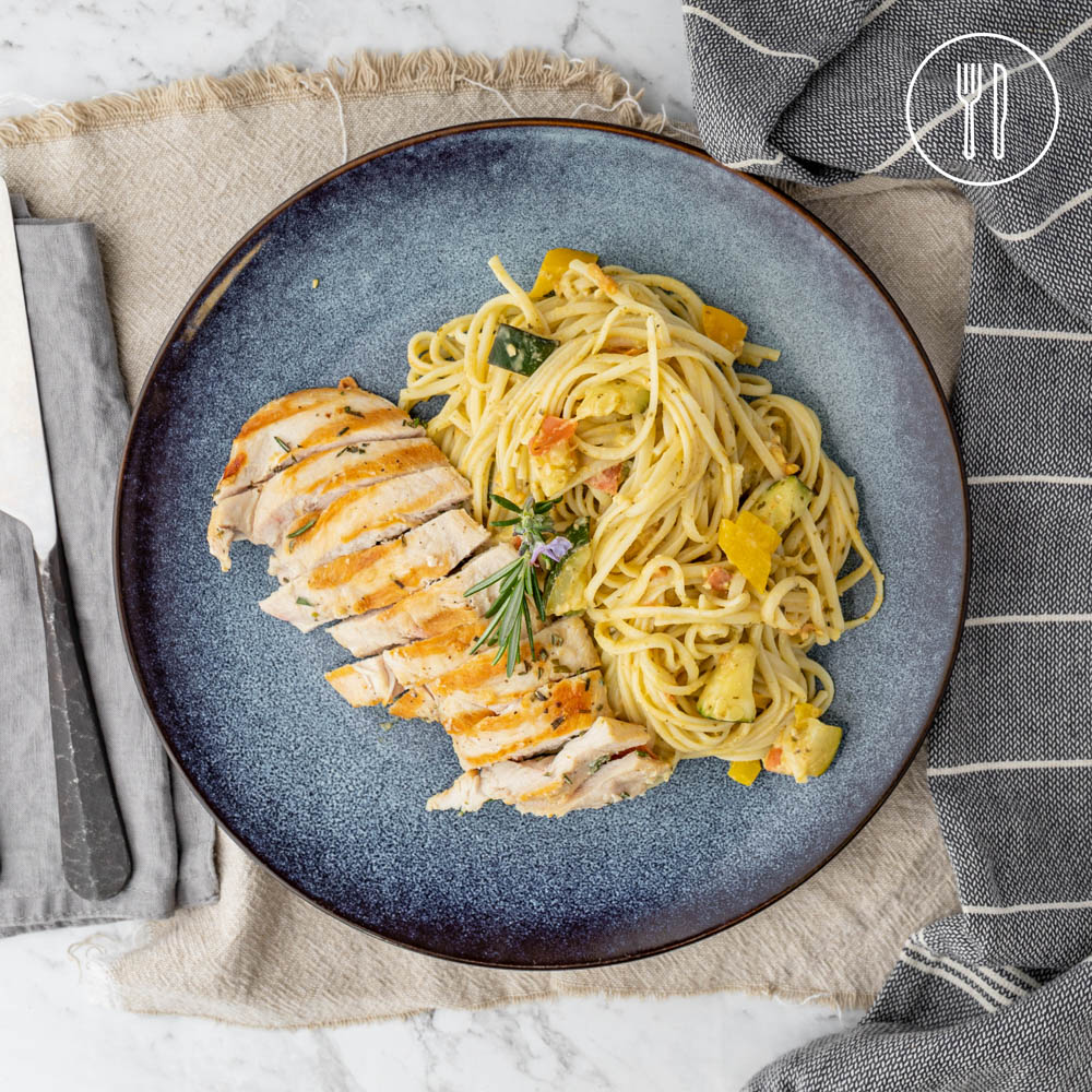 Grilled rosemary chicken schnitzels, sliced and served alongside pesto tossed spaghetti with garlic vegetables.