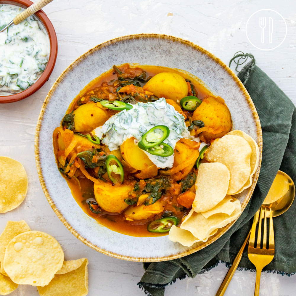 A flavourful and filling curry of baby potatoes and baby spinach, served with refreshing mint and cucumber raita, crunchy pappadums and green chilli!
