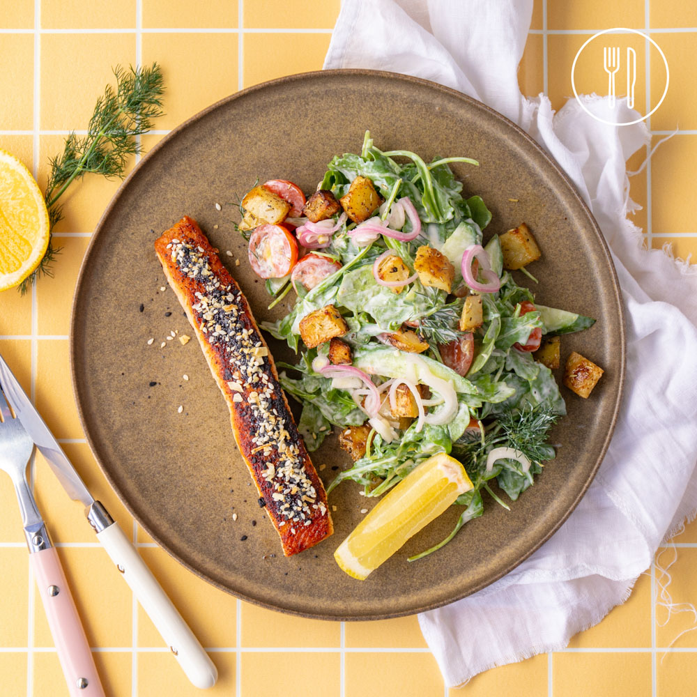 Salmon fillets coated with custom-blend everything bagel seasoning, served with a fresh dill and lemon yoghurt salad, and roast potato croutons.