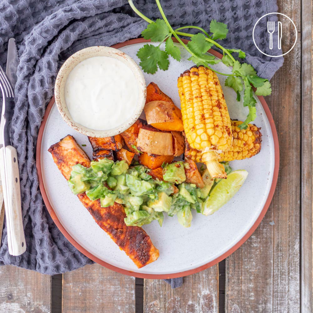 Lightly spiced salmon roasted with sweet potato and corn, served with a creamy avocado salsa tossed in a zesty lime yoghurt sauce.