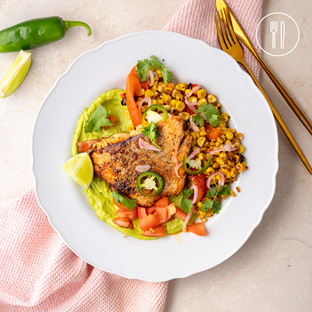 Salmon fillets coated with a mild cajun spice mix, served on a flavourful jalapeño, coriander and lime avocado dip with charred corn, capsicum and fresh toppings.
