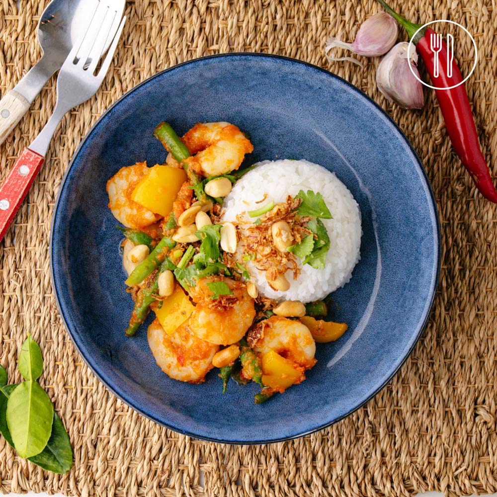 Fresh prawns cooked in a fragrant chilli and kaffir lime sambal sauce, paired with tender green beans. Served over fluffy jasmine rice and finished with a crunchy peanut and fried shallot topping for the perfect balance of heat, freshness, and texture.