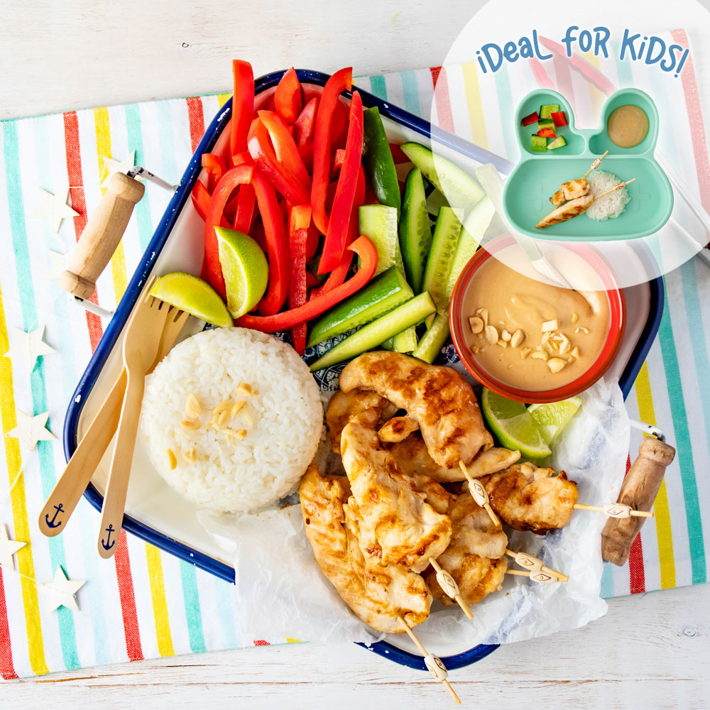 Grilled chicken tenderloins served with sticky rice, veggie sticks and a homemade satay sauce. Finished with crunchy peanuts.