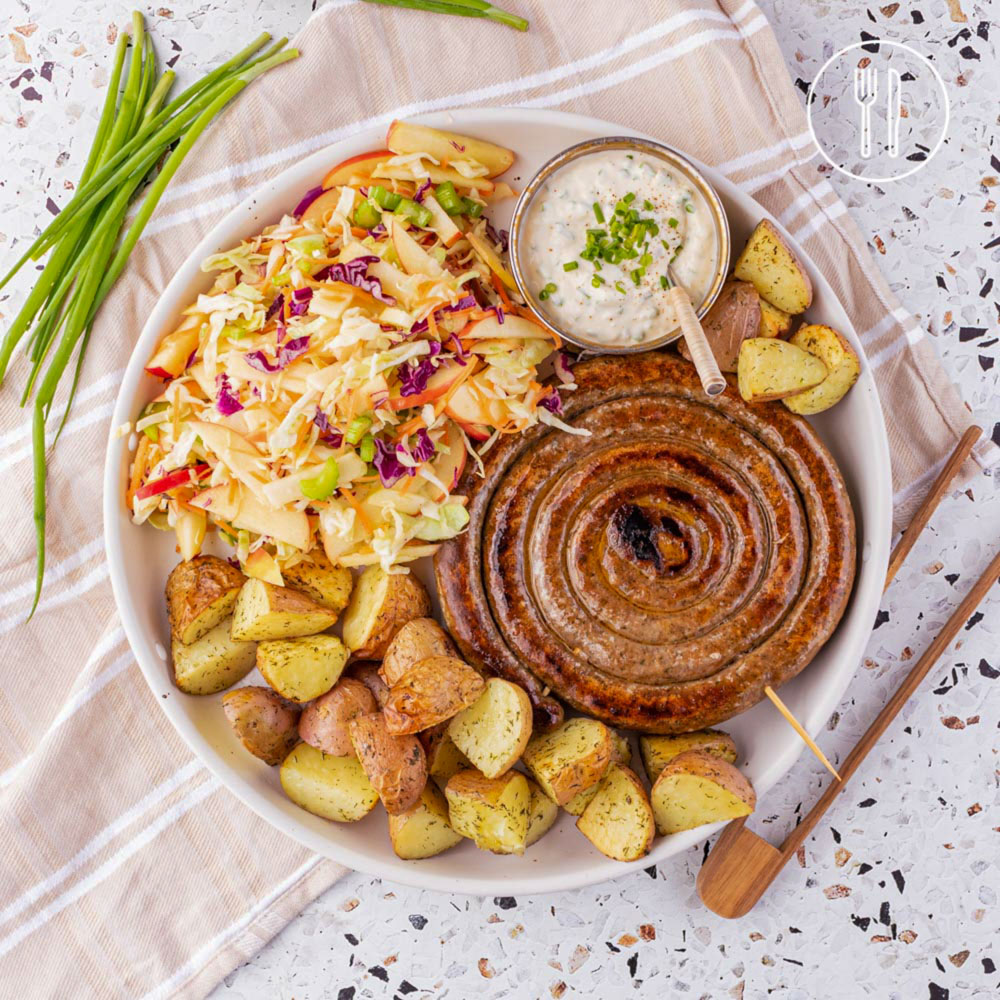 A beef sausage coil served with herb roast potatoes, apple coleslaw, and creamy French onion dip, this dinner is best-enjoyed family platter style!