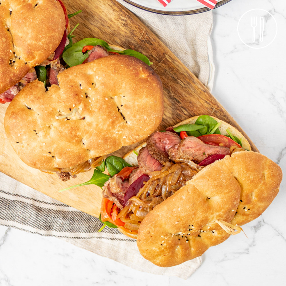 Warm and crusty Turkish rolls filled with sliced steak, roast tomato, beetroot and spinach, topped off with homemade caramelised onion.