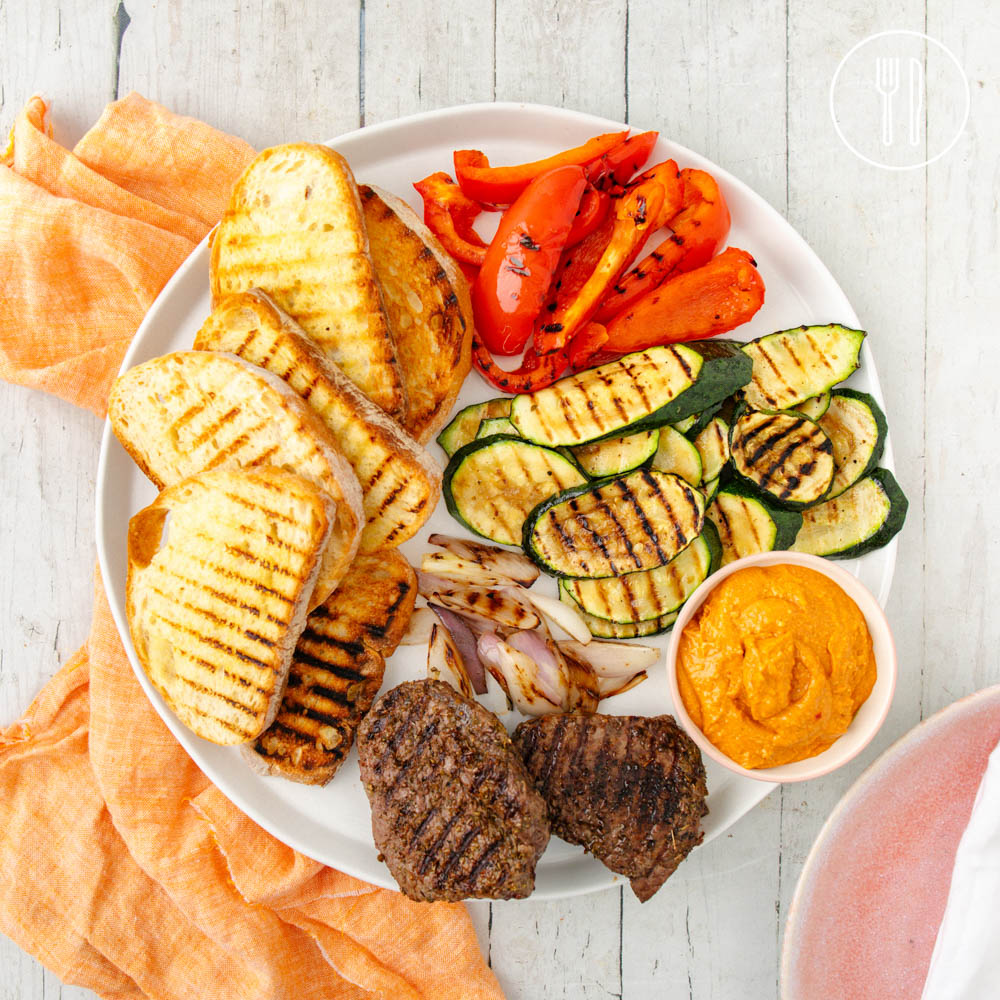 Beef steaks and rainbow barbecued vegetables served with a crunchy red dip and slices of fresh, crusty ciabatta bread.