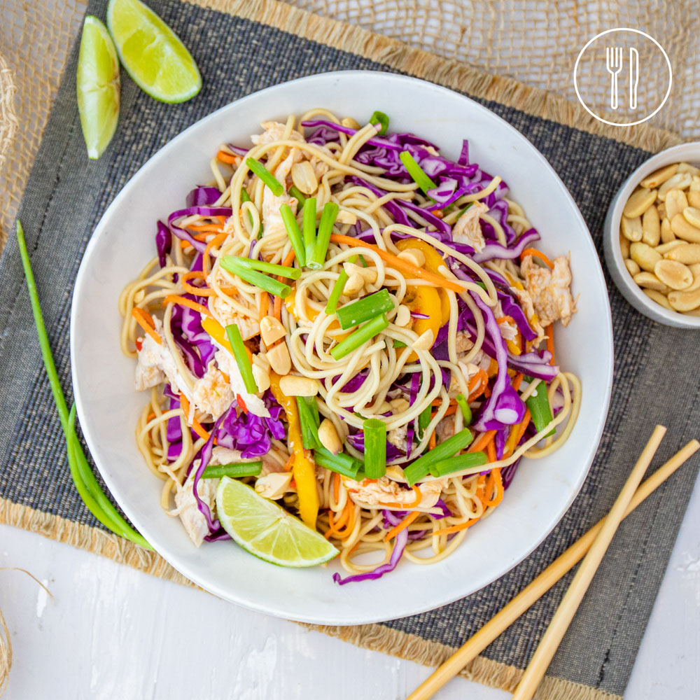 A colourful noodle salad with poached chicken, mango and chives, all tossed with a sweet chilli and lime dressing and finished with roasted peanuts.